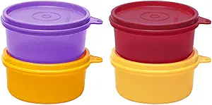 Product Description = Tupperware Plastic Meal Holder Bowls are a set of four small bowls designed for storing and carrying small portions of food. Each bowl has a capacity of 0.21 liters, making them perfect for holding snacks, side dishes, or individual servings of food. The bowls come in a vibrant Tropical color scheme, featuring shades of orange, yellow, purple, and maroon. The bright colors not only add a pop of fun to your kitchen or dining table but also make it easy to identify which bowl belongs to each person. The bowls are made of high-quality plastic that is durable, lightweight, and easy to clean. This makes them ideal for everyday use, whether you're packing lunch for work or school, storing leftovers in the fridge, or serving snacks at a party. The bowls have a tight-fitting lid that seals securely to keep your food fresh and prevent leaks or spills. The lids also make it convenient to stack the bowls on top of each other for compact storage in your kitchen cabinet or fridge. These Tupperware bowls are not only practical but also versatile. You can use them to store a wide range of foods, from salads and dips to fruit and nuts. The bowls are also microwave-safe, allowing you to heat up food directly in the container without having to transfer it to another dish. This feature makes them convenient for reheating leftovers or preparing meals on the go. Additionally, the bowls are freezer-safe, so you can use them to store food for later use or to make and store individual portions of meals in advance. The compact size of these bowls makes them ideal for portion control, helping you manage your food intake and avoid overeating. You can use them to pack pre-portioned snacks or meals for yourself or your family members, making it easier to stick to a healthy eating plan. The individual bowls also make it convenient to pack lunches for multiple people, allowing each person to have their own portion of food without the need for additional containers. In addition to being practical and functional, these Tupperware Plastic Meal Holder Bowls are also eco-friendly. By using reusable containers like these bowls, you can reduce your reliance on single-use plastic bags and containers, helping to minimize waste and protect the environment. The durable construction of the bowls ensures that they can be used repeatedly, making them a sustainable choice for storing and transporting food. Overall, Tupperware Plastic Meal Holder Bowls are a versatile and convenient solution for storing and carrying small portions of food. With their colorful design, durable construction, and practical features, these bowls are sure to become a staple in your kitchen for meal prep, storage, and serving needs.