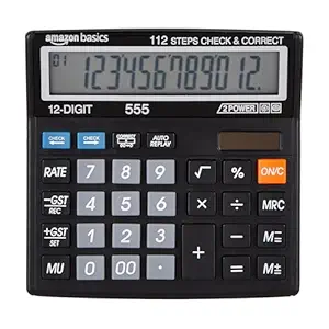 Product Description = Introducing the Amazon Basics AB-555 12 Digits GST & Tax Calculator with 112 Steps Check and Correct, designed for efficient tax calculations with dedicated tax keys for price plus tax, tax amount, and price less tax, enhancing user convenience. Its generous 12-digit large LC Display ensures clear visibility and efficient calculations, while its durable build with anti-scratch LCD screen, anti-slip pads, and anti-break technology guarantees longevity and resilience. With error-free precision and dual power options for flexibility, backed by a 1-year limited warranty, it offers peace of mind for customers.