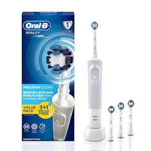 Product Description = Introducing the Oral-B Vitality White Rechargeable Rotating Electric Toothbrush, the essential toothbrush for achieving a professional clean. Designed for adults, this electric toothbrush offers a superior brushing experience with its 2D Cleaning Action that oscillates and rotates to remove up to 100% more plaque compared to a regular manual toothbrush. The round brush head, with crisscross bristles angled at 16 degrees, cups each tooth for a more effective clean. Featuring a built-in professional 2-minute quadrant timer, it ensures you brush for the dentist-recommended duration, vibrating every 30 seconds to alert you to change the brushing area. With two brushing modes—Daily and Sensitive—it caters to both regular and sensitive teeth and gums. Waterproof with an IPX7 rating, this toothbrush is designed for durability and ease of use. Experience the dentist-inspired round brush head from Oral-B, the #1 brand recommended by dentists worldwide, and enjoy a 30-day money-back guarantee for a risk-free trial. Make the Oral-B Vitality Blue a part of your daily routine and experience the difference in oral care with advanced plaque removal and improved gum health. This Oral B Vitality pack comes with 4 additional refills for year-around oral care and is compatible with a variety of Oral-B toothbrush heads, including CrossAction, Precision Clean, Sensitive Clean, and more, offering versatility to suit your specific needs.